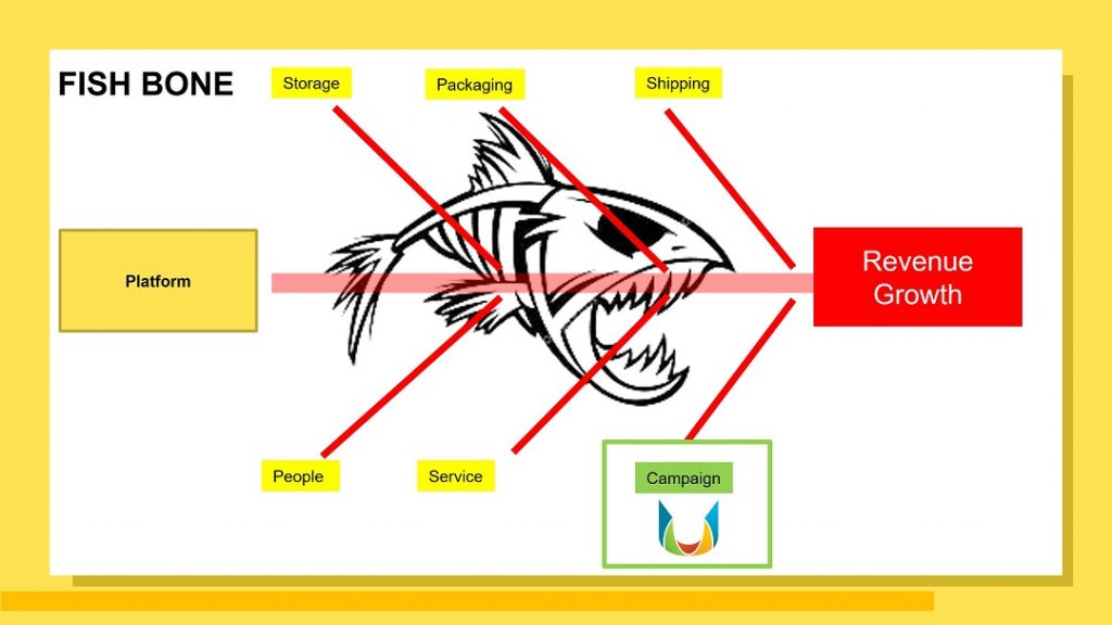 Setiap pebisnis, tentu saja menginginkan hasil akhir dari aktivitas marketing adalah terjadinya peningkatan penjualan. Dalam analisa fish bone ini, kita dapat melihat bahwa goals Anda adalah meningkatnya pendapatan bisnis ada di bagian ujung sebelah kanan.