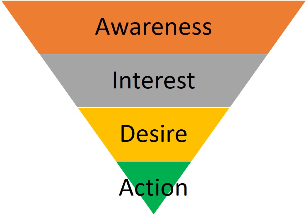 Awareness (tahu/sadar) —> Interest (tertarik) —> Desire (berhasrat) —> Action (membeli/menghubungi)