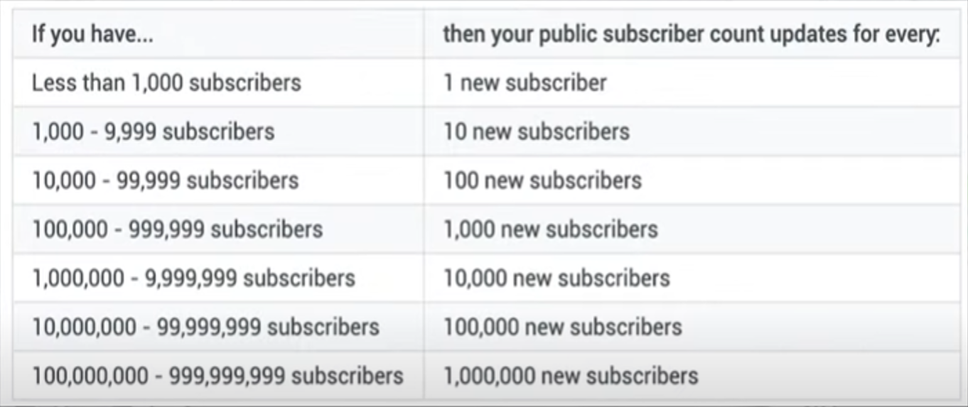 Dari tabel diatas, kita bisa mengetahui jika jumlah subscriber youtube Anda masih dibawah 1000, maka update penambahan subscriber akan dilakukan setiap ada 1 subscriber baru. Sedangkan pada kolom bawahnya, jika jumlah subscriber Anda kurang dari 10.000 maka update penambahan subscriber akan dilakukan setiap ada 10 penambahan subscriber baru, dan seterusnya. Semoga paham yaa membaca tabel diatas.