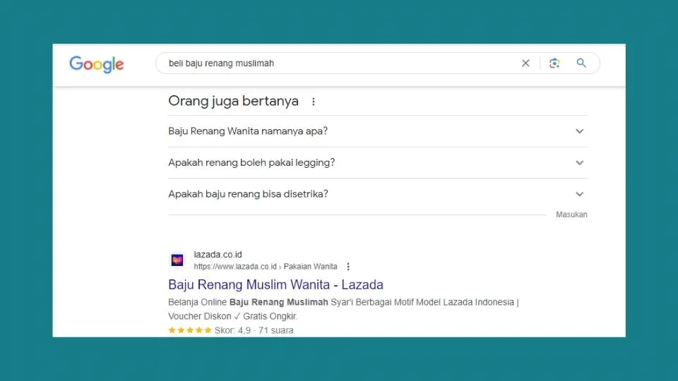 Misalnya, kamu ketik “beli baju renang muslimah” di Google, artinya kamu lagi cari tempat buat beli beli baju renang yang khusus untuk muslimah.